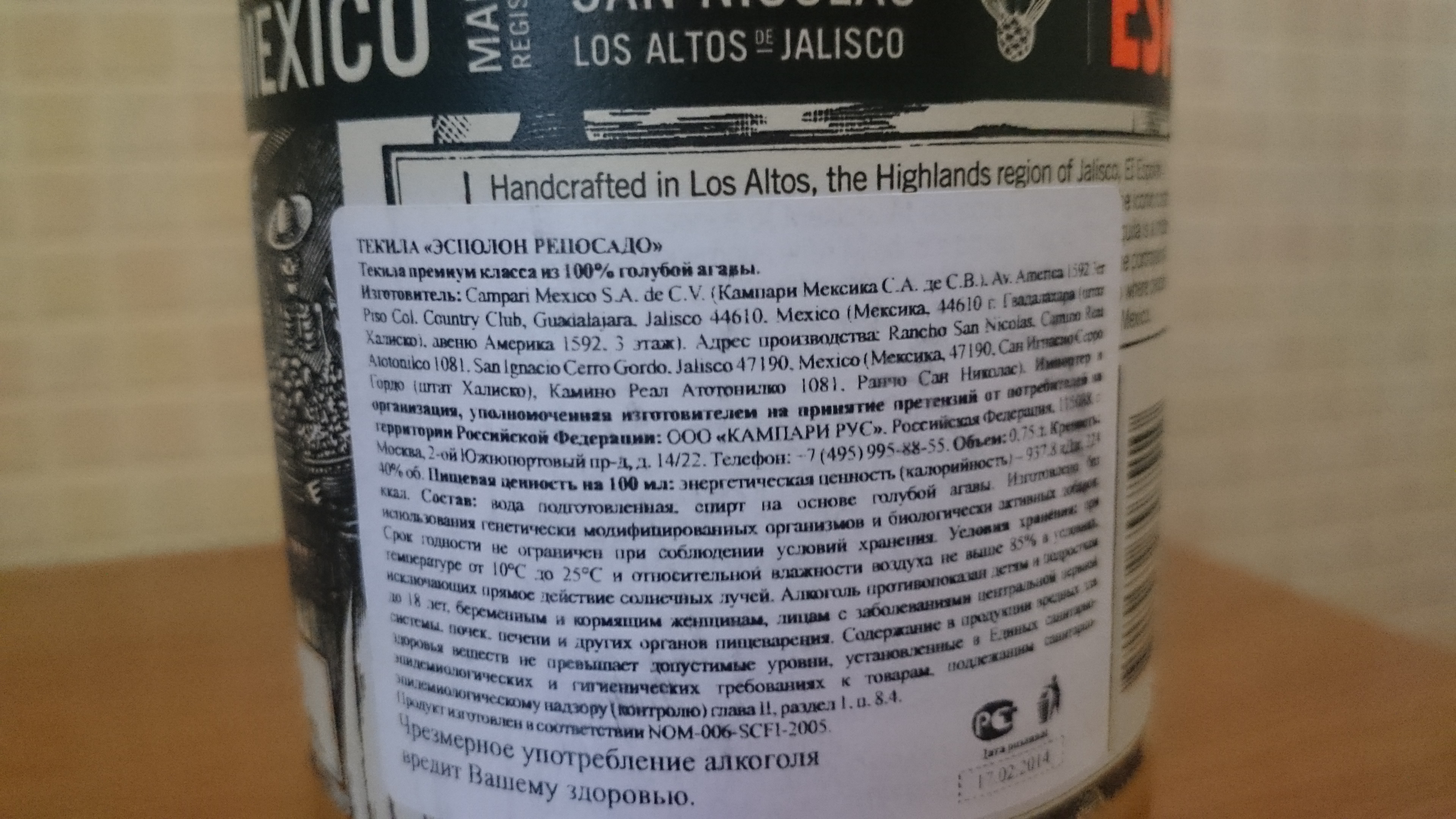 >>35289 Наверно лучшая текила в плане цена/качество которую можно без проблем найти в российских магазинах. Вообще, если на текиле написано "100% агавы", то это уже как минимум не плохой продукт. Алсо: >Текила "Espolon" Blanco была отмечена наградами на многих престижных конкурсах: >— Золотая медаль на "International Review and Spirits, 2010"; >— финалист конкурса "Ultimate Spirits Competition, 2011"; >— Двойное золото на "San Francisco World Spirits Competition, 2011"; >— Серебряная медаль на "International Wine and Spirits Competition, 2012".
