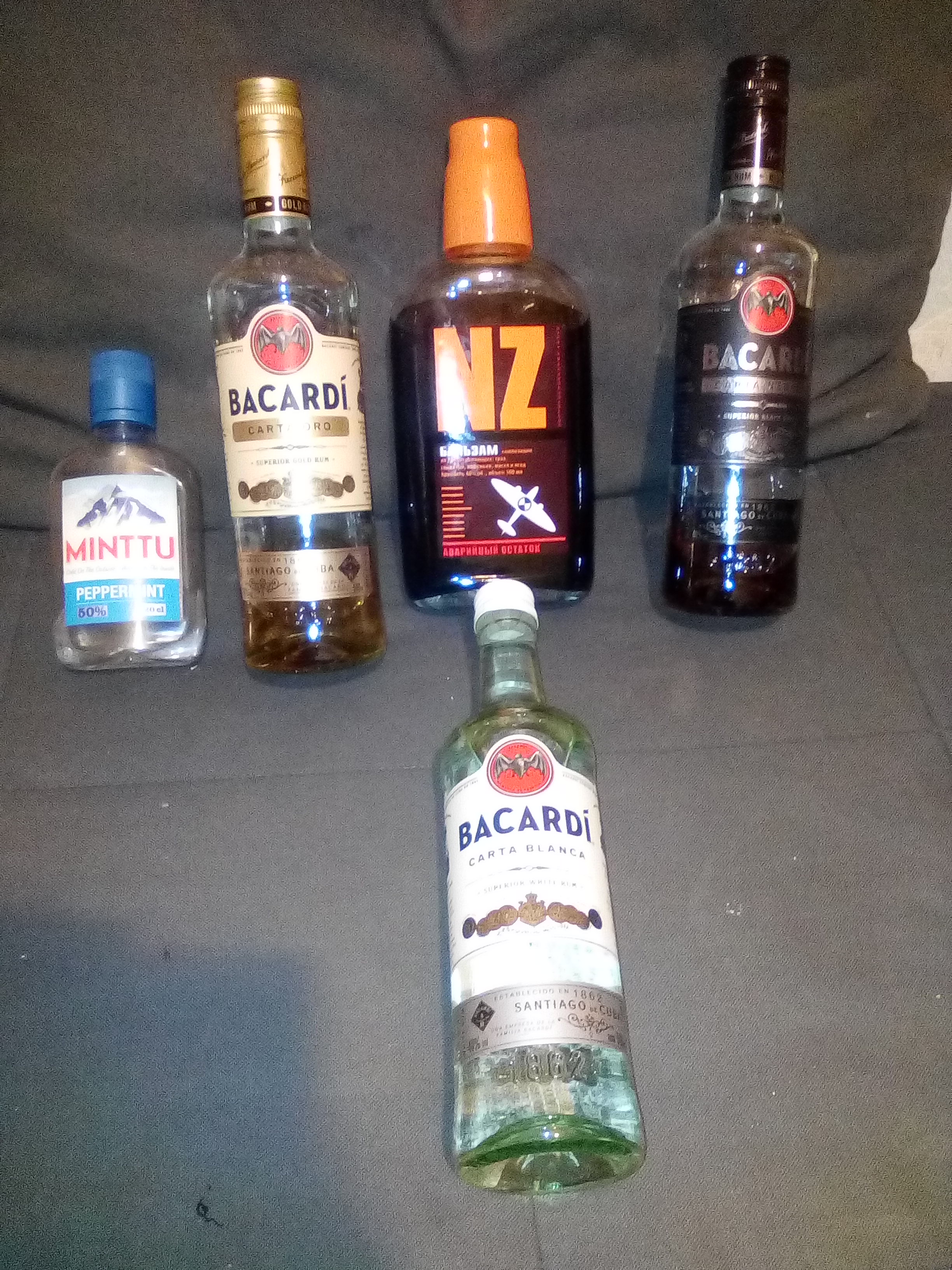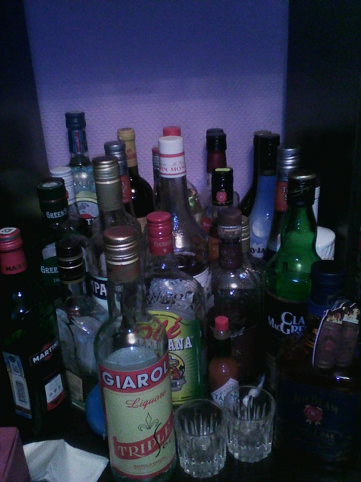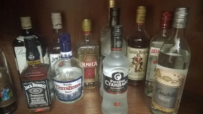 >>287 1. текила репосадо. со скелетами на этикетке, название не помню. стоит полная на две терти в холодильнике. 2. Еще одна бутылка текилы валяется в диване. сауза. 3. две бутылки баккарди по 0, 75 - 8летний и золотой, оба в подарочных упаковках. стоят с прошлого года. 4. амаретто, ксу-ксу, какой то немецкий молочно-шоколадный ликер - стоят, иногда употребляем с тян.