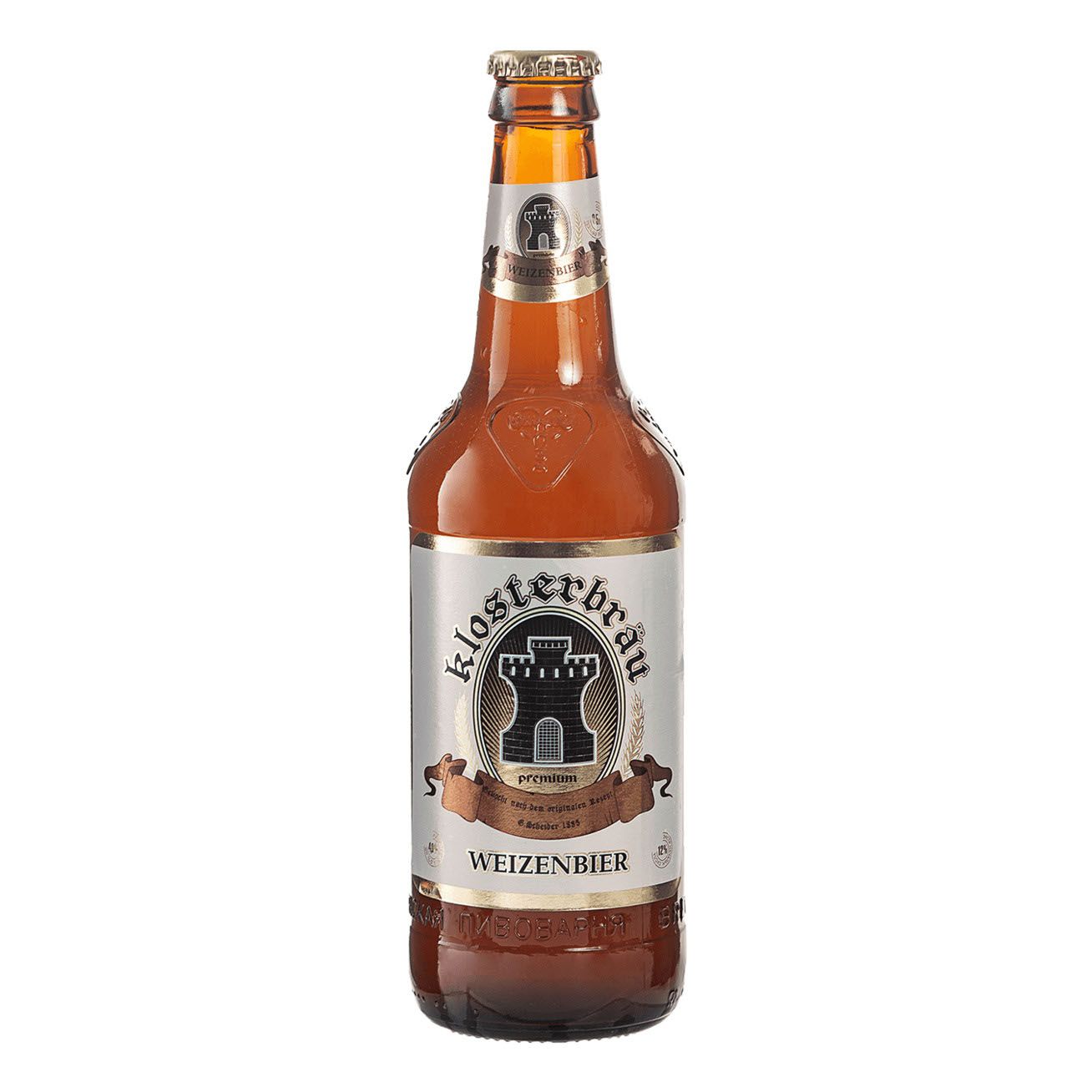 Светлое непастеризованное нефильтрованное неосветленное пшеничное «Клостербрау пшеничное». Состав: вода подготовленная, солод пивоваренный ячменный светлый, солод пшеничный, хмель, дрожжи. 12%, 4%. Изготовитель: ЗАО «Пивоваренный завод Лысковский». ГОСТ 31711. Объем: 450 мл, 500 мл, 1,0 л, 30 л, 50 л. Срок годности 91 суток в стеклянной бутылке. Штриховой код: 4607040743858, 4607040746668, 4607040746293, 4607040746309, 4607040746316;