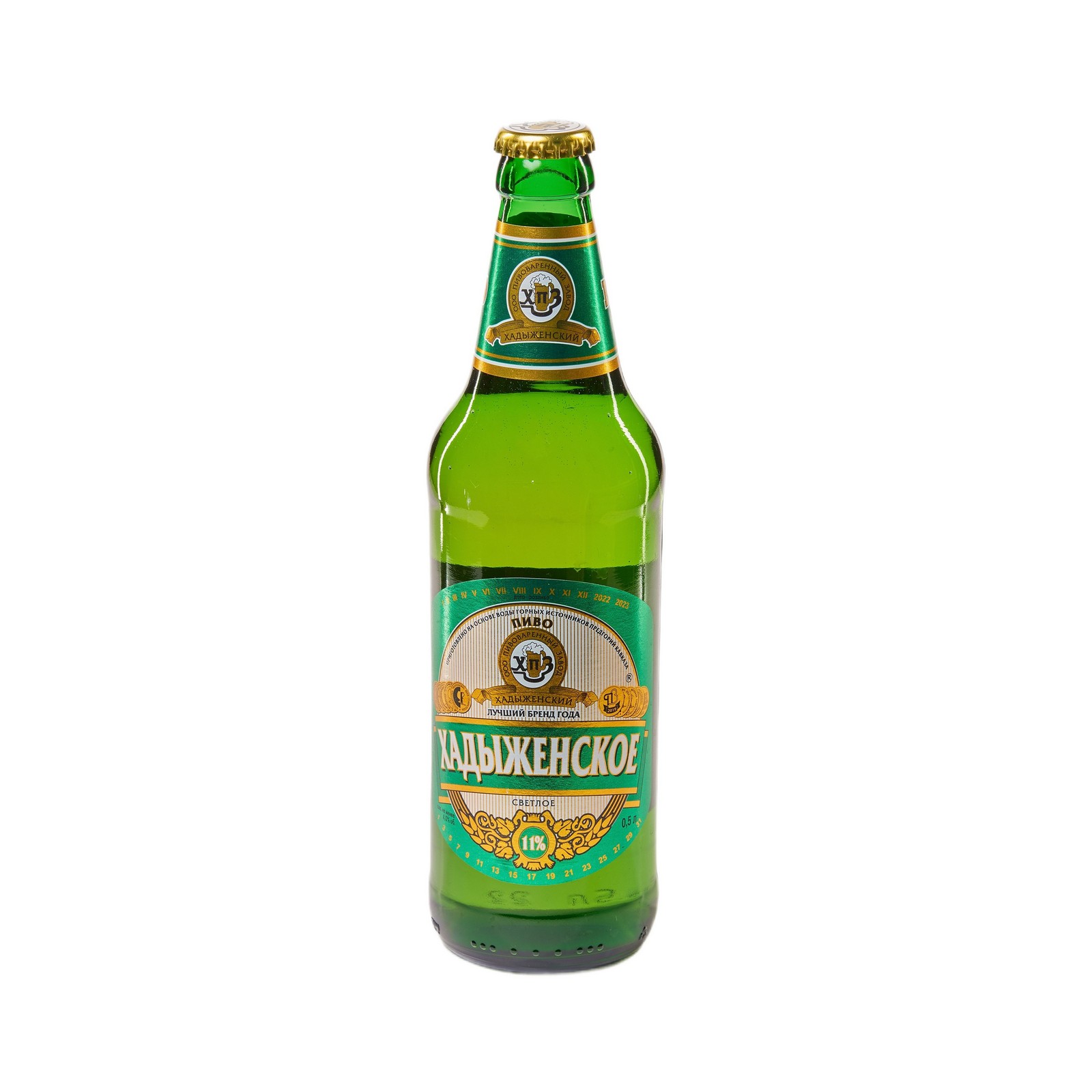 Светлое непастеризованное фильтрованное «Хадыженское». Состав: вода питьевая, солод пивоваренный ячменный, хмелепродукты. 11%, 4,5%. Изготовитель: ООО «Пивоваренный завод Хадыженский». ГОСТ 31711. Объем: 500 мл, 50 л. Срок годности 15 суток в стеклянной бутылке. Штриховой код: 4610003530013, 4610003530044. Это пиво есть не что иное как фильтрованное Жигулевское;