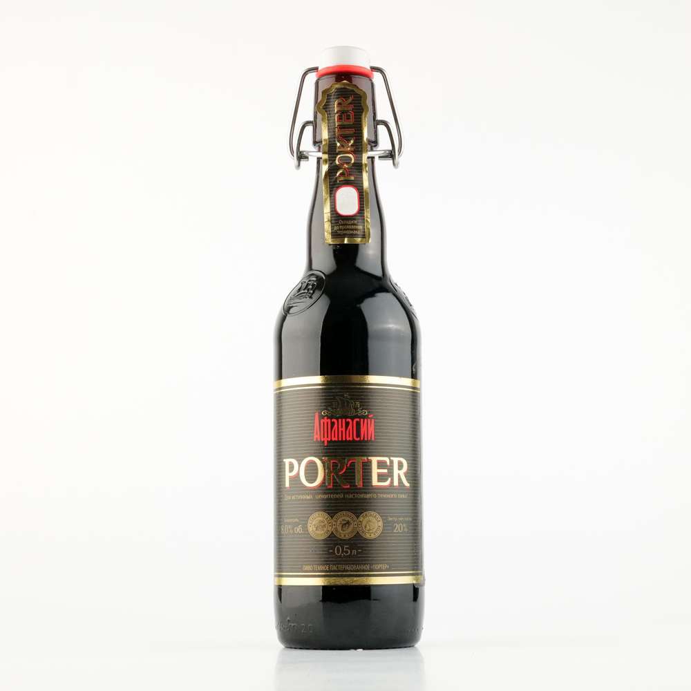 Темное пастеризованное «Портер». Состав: вода питьевая, солод пивоваренный ячменный (светлый, карамельный и жженый), сахар, хмель. 20%, 8%. Изготовитель: ООО «Частная пивоварня “Афанасий”». ГОСТ 31711. Объем: 500 мл, кеги. Срок годности 360 суток в стеклянной бутылке. Штриховой код: 4610017684474;