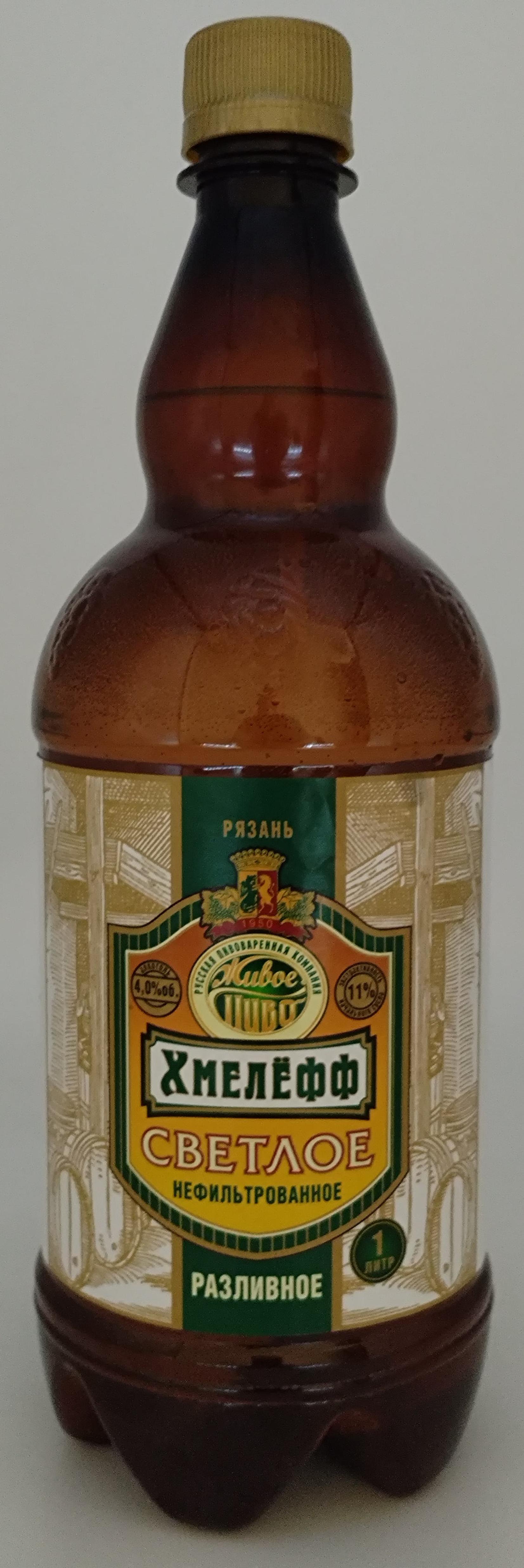 Светлое непастеризованное нефильтрованное осветленное «Хмелёфф светлое». Состав: вода, солод ячменный светлый, хмель гранулированный, дрожжи. 11%, 4%. Изготовитель: АО «РПК „Хмелёфф“». ГОСТ 31711. Объем: 1,0 л, 30 л. Срок годности 19 суток в пластиковой бутылке. Штриховой код: 4602124001923, 4602124001541. Это пиво есть не что иное как нефильтрованное Жигулевское;