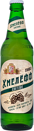 Светлое пастеризованное фильтрованное «Хмелёфф». Состав: вода, солод ячменный светлый, хмель гранулированный. 13%, 5,2%. Изготовитель: АО «РПК „Хмелёфф“». ГОСТ 31711. Объем: 450 мл, 30 л. Срок годности 180 суток в стеклянной бутылке. Штриховой код: 4602124002722, 4602124002975, 4602124002180;