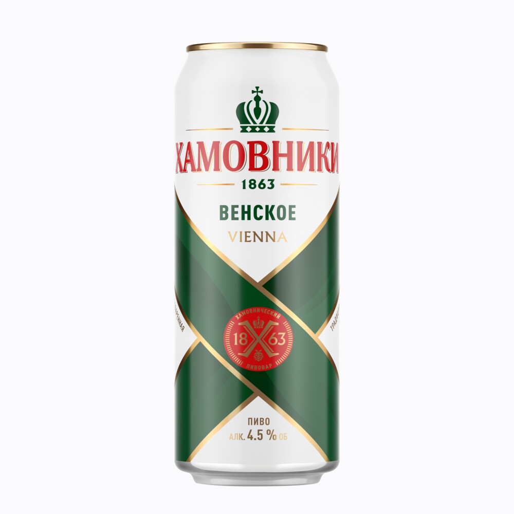Светлое пастеризованное фильтрованное «Хамовники венское». Состав: вода питьевая, солод пивоваренный ячменный, хмелепродукты. 11%, 4,5%. Изготовитель: ЗАО «МПК». ГОСТ 31711. Объем: 450 мл, 20 л. Срок годности: 274 суток в металлической банке. Штриховой код: 4680036912384, 4650243870715;