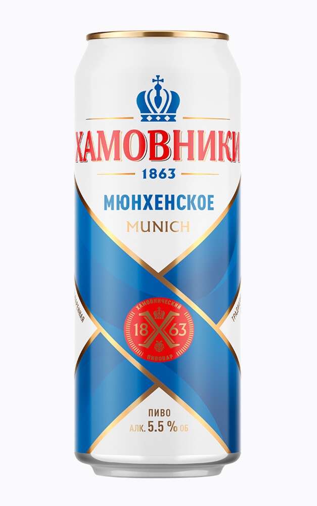 Светлое пастеризованное фильтрованное «Хамовники мюнхенское». Состав: вода питьевая, солод пивоваренный ячменный, хмелепродукты. 13%, 5,5%. Изготовитель: ЗАО «МПК». ГОСТ 31711. Объем: 450 мл. Срок годности 274 суток в металлической банке. Штриховой код: 4680036914265. На самом деле это полутемное пиво;