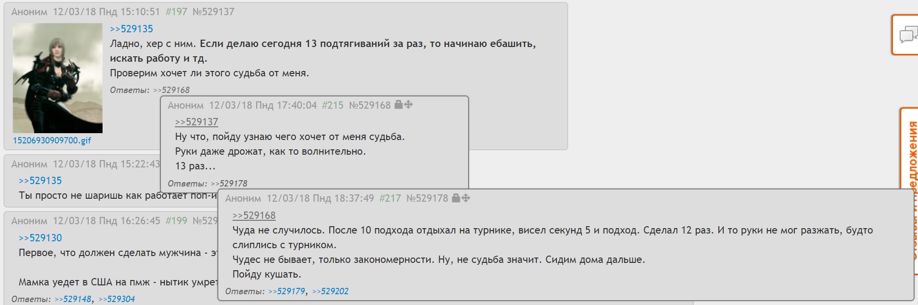 >Что ни слово, то блядь философские конструкции, лишенные зерна существенности. Открытия уровня водка - яд. Этанол, вот иди нажрись. Бухай 12 часов. И на утро у тебя тоже будет такая "постбодуновая философия". >А имеешь ли ты моральное право давать такие советы? Ведь ты сам в этом не уверен. Я считаю что имею. Да я не образец как бы. Но пример того как себя можно довести до срыва. Я прошел туда и обратно. И если у анона будет похожая ситуация, он может примерить это на себя и успокоиться.
