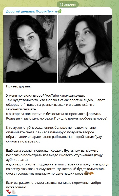 вроде банальный канал очередной асмр девочки, но недавно у неё появилась всё та же, банальная, очередная приватка именуемая как бусти, контент там вполне смотрибельный(до этого она хотела открыть приват в тг и постить там своё тело, но из личной переписки я узнал что парень её немного против этого, но сейчас имеем что имеем)
