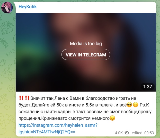 >>139567 >забаню в телеге Изначально, Лена создала телегу без какого-либо желания ее вести. Только потому что её просили. Сразу почувствовался ее похуестический настрой к телеге. Заходил туда пару раз когда ещё коменты были закрыты - унылое гавно наотъебись. Я подписан на КК, но она хотябы сама ведет ее и что-то постит, фотки, опросы, отвечает, какой-то интерактив с аудиторией, но лене похуй, у нее есть инста. Так что не понимаю что вы тут все с телегой носитесь. Раз активничает она в основном в инсте. Разве что там у нее все россияне, а в РФ инста таво....