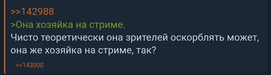 Она на своём стриме может делать что хочет, может запустить стрим и съебать тусить со своим ёбарем, может оставить своих кошек вместо себя, может сидеть в носу ковырять. Факт? Факт. Люди которую будут смотреть контент который им не нравится (по любой причине: не нравится что происходит на стриме, не нравятся плямканье, не нравятся донаты, не нравится пиздёжь) - очевидно умственно отсталые. Факт? Факт. Люди, которые вместо того чтобы забить на якобы пиздабольную двуличную стримершу и не создать информационный фон (чтобы просмотры её бесконечных одинаковых видосов упали ещё ниже) сидят и высирают желчь 66 тредов и создают движуху - либо реально тупые, либо больные на голову. Факт? Факт.