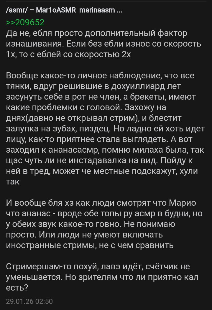 Судя по письму, ты постоянный зритель Марио. Только не понимаю, зачем ее как-то дефаешь. Потому что анонша базовые вещи пишет - 90% асмрщиц в ру вкладке пиздлявые шлюхи, и этот тред про одну из них. Не стоят и капли времени, чтоб ими интересоваться