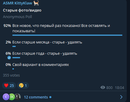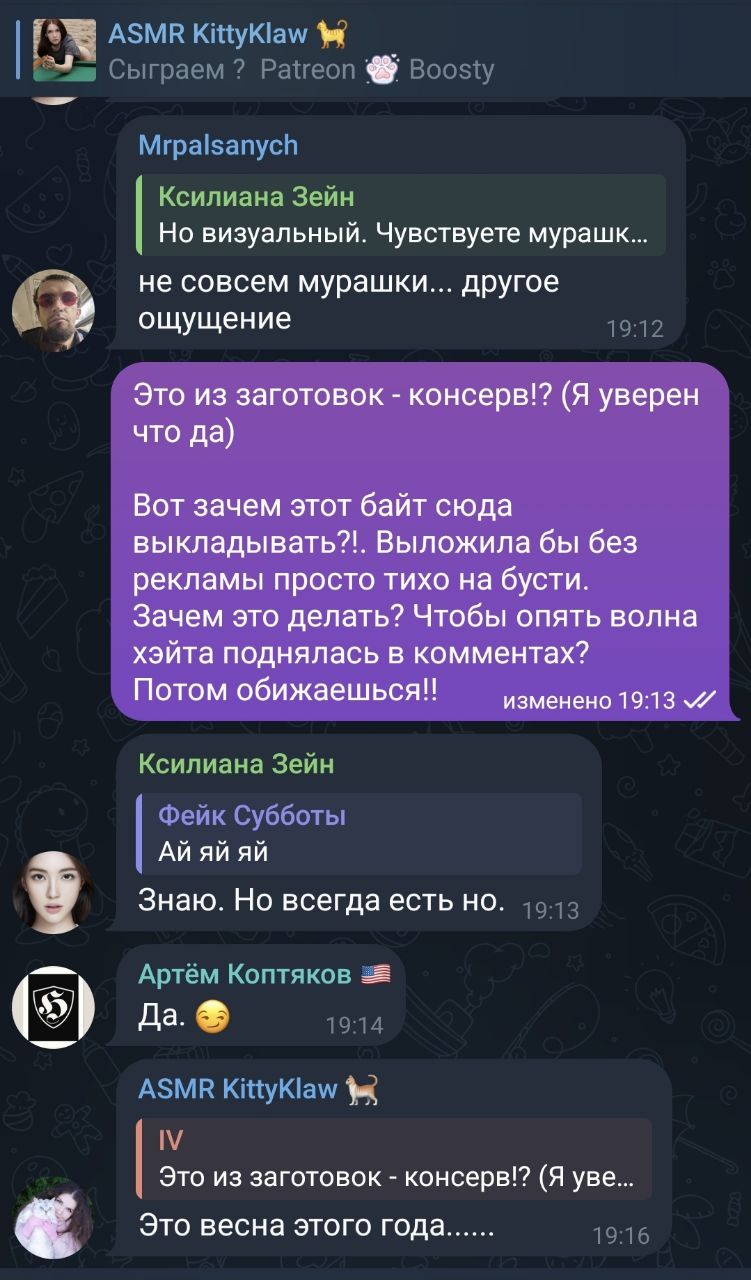 >>203961 >платники, которые могли бы массово взбунтоваться и начать пилить её Ты прав оказался, буквально недавно в телеге у Гели был бунт гоев, что она аж комменты закрыла, оставив их только для избраных, а сегодня запилила опрос по своему контенту. Надеюсь услышит наконец аудиторию. Кстати, судя по результатам опросов, большинство за то что бы на ютабах был норм долгий асмр, а на бустиках сексуальный жопоконтент.
