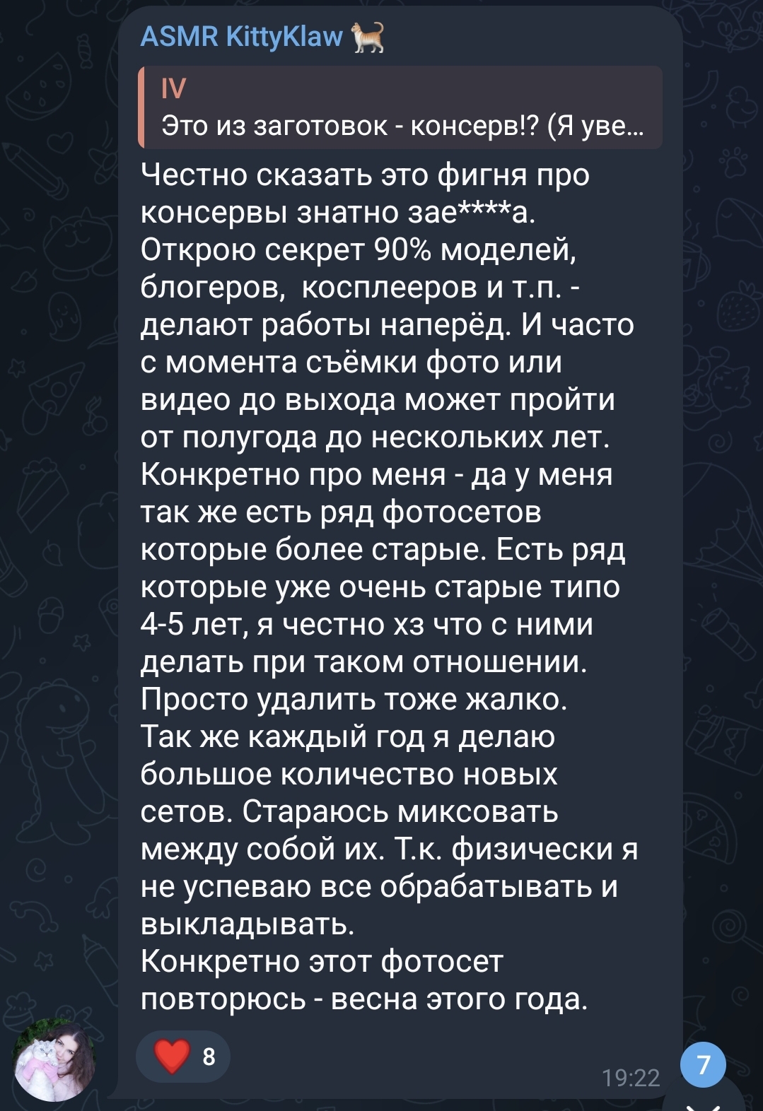 Ебать тут срач развели из-за однотипного фотосета. Никогда не понимал смысла реагировать так активно на контент, который в АСМР и нахуй не нужОн. Ладно бы видос разносили там, но фотки...