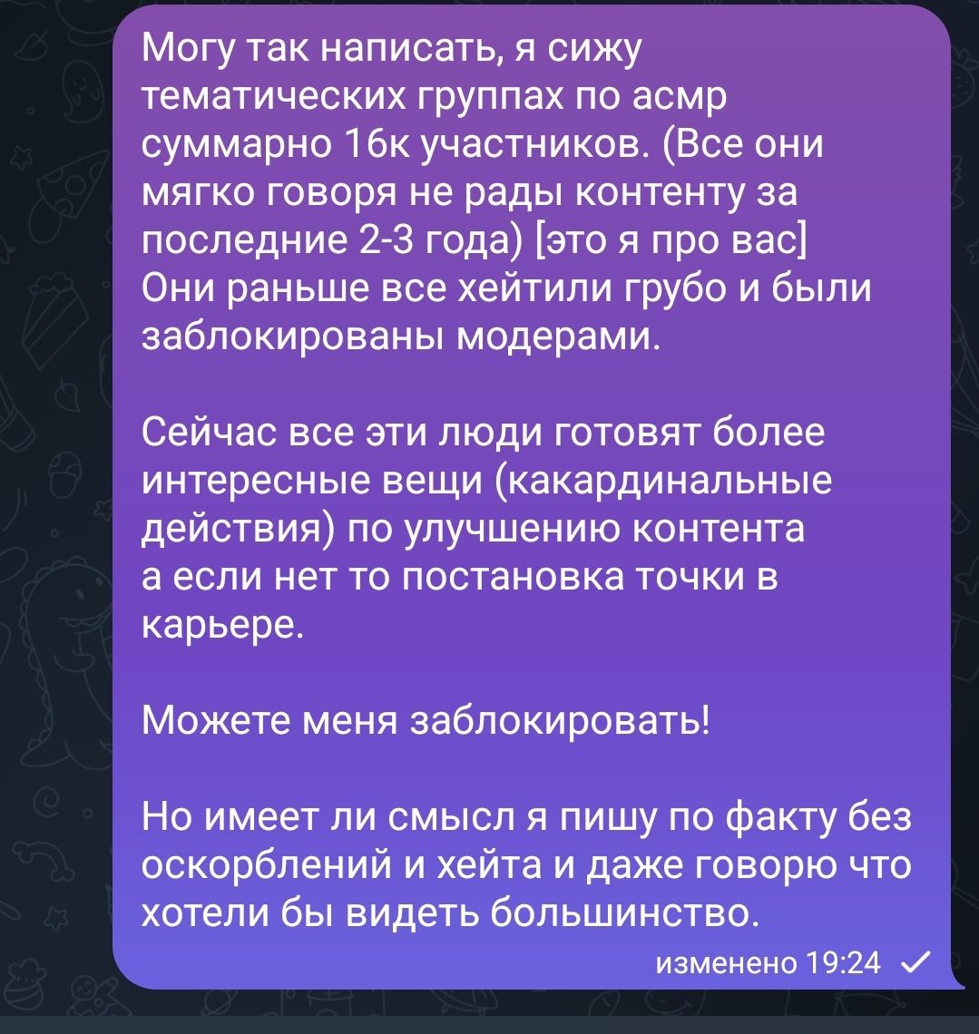 её бы технику, камеры, свет, компик дать молодым асмрщицам, которые ещё не потеряли энтузиазм и желание ебашить, нас бы офигенный контеннт ждал
