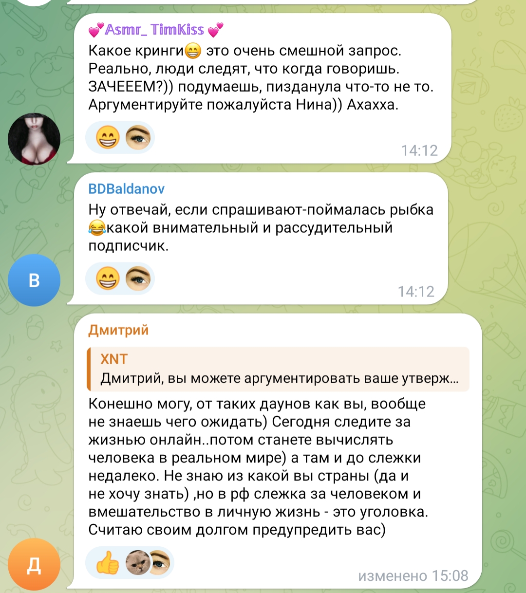 напоминаю, как только я слил диалоги гели и нины, геля прпоала из её чата, всё что пиздит и делает - лишь от лени и пиздёж (ходит по траве с котами не доай бог покажет край дома чтоб никто не знал никогда где она живёт , раз ты так боишься а свою жизнь удаляй всё на хуй и в дурку, странно оскорблять людей что им пора в дрку если создатель асмр геля - сама удается в псих помощи, нина асмр уже несколько лет ходит к психологу