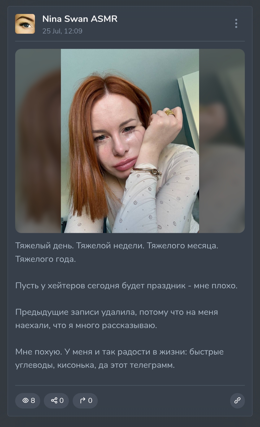 >>197222 Ничего необычного. Слёзовыжимательные посты с целью получения пожалеек и донатов от симпов. Чисто рабочий момент для медиаличности с ХХ хромосомой
