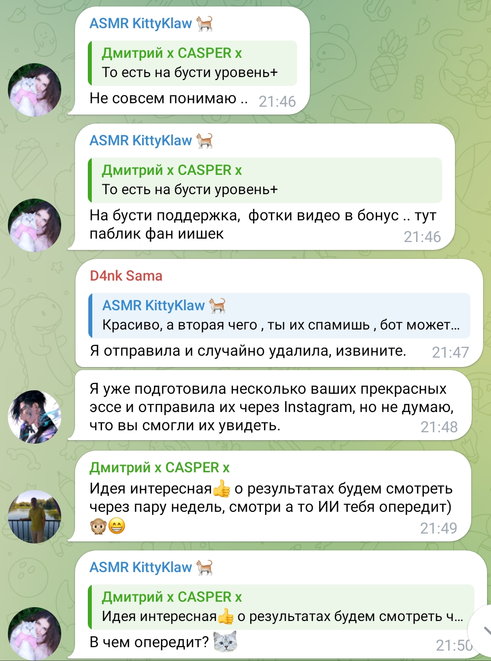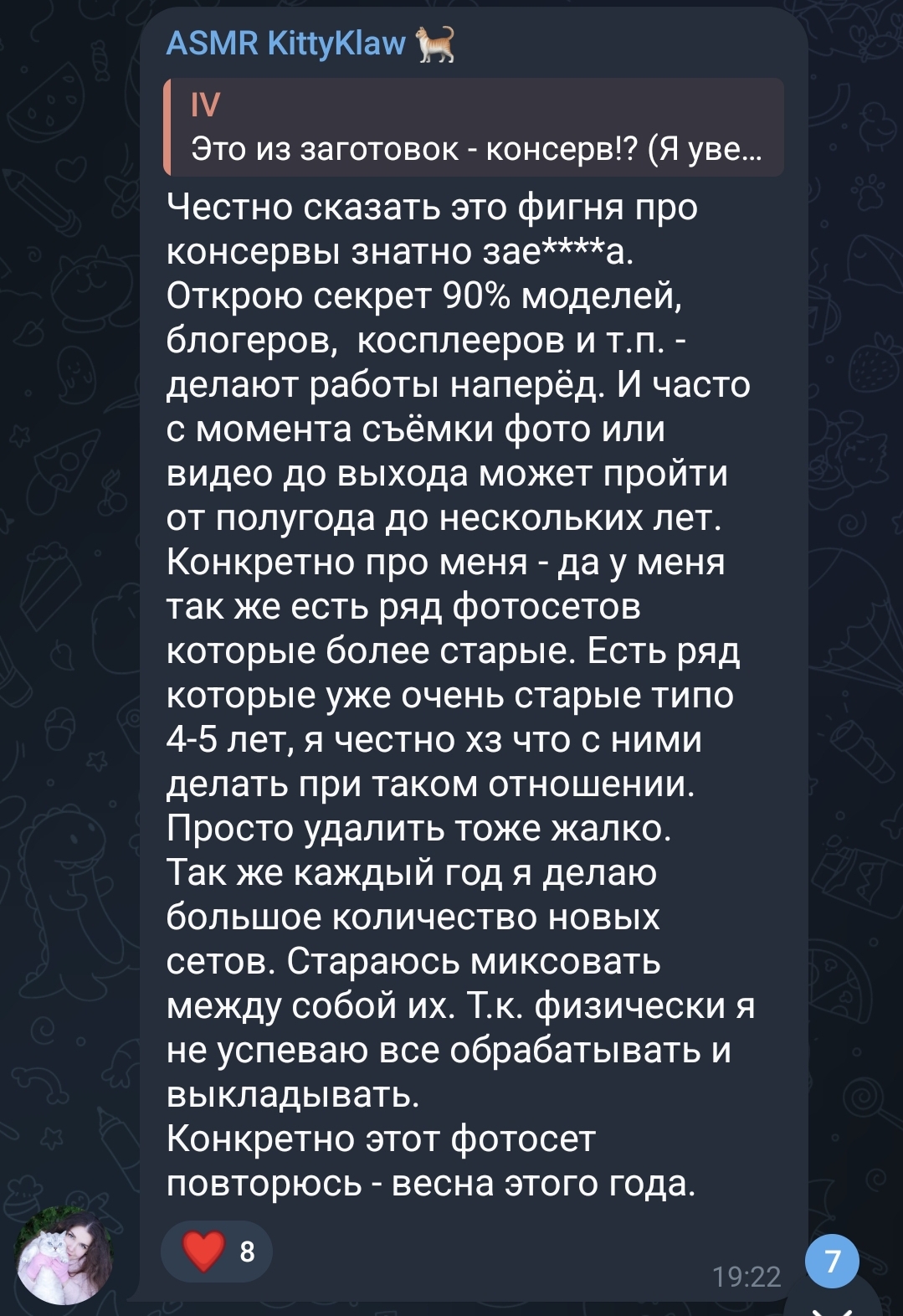 она не понимает что ии скоро будет интереснее смотреть чем оригинал, особенно с её враньём что не муж снимает (просто зачем врать) и экспериментами странными (накладные сиськи зачем, если это просто поддержка, а не чтобы дрочить, ведь на бусти нет "дурных") и как я понял что старое под видом нового всё чаще выкладывает (сфоткала, выложи, не ленись или лечись, какие нахуй тараканы, она их не видела никогда в реале то и не понимает что строить больную на голову у неё не получается, кури бухай матерись что она умеет делать, если заебал образ за 10 лет).