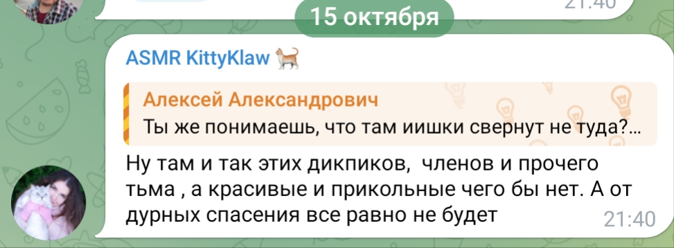 >>206253 Чел, это бесполезно объяснять. Малолетки-инцелки привыкли, что им письку светят "бывшие" АСМРщицы, которые по факту давно уже на онлик перешли и в другой тематике работают, которая с АСМР мало общего имеет. Тут же от Гели по факту требуют невозможного, что бы она как потасканная муна светила вареник и сиськи.