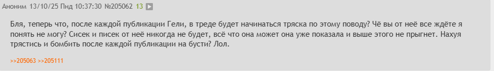Бля, теперь что, после каждой публикации Гели, в треде будет начинаться тряска по этому поводу? Чё вы от неё все ждёте я понять не могу? Сисек и писек от неё никогда не будет, всё что она может она уже показала и выше этого не прыгнет. Нахуя трястись и бомбить после каждой публикации на бусти? Лол.