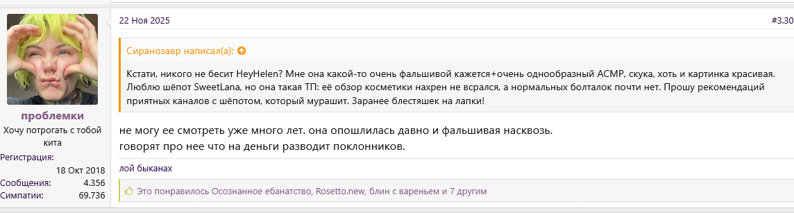 Про копирование привычек 100% совпадение. Я посмотрел у него инсту там пиздец, Лена фоткает уточек, он тоже начал фоткать уточек, Лена фоткает кошек, он тоже фоткает кошек. Начал писать по украински, чтобы понравится Лене. Полностью подстраивается под нее. Все время проводит на ее страницах, если кто то напишет плохой коммент про нее он сразу не щадя клавиатуры вступает в словесную схватку, каждый раз пытается блеснуть остроумием но получается высер. Он одержим ею, платит ей, чтобы она не отвергла его. Потерял способность к критическому мышлению, не может понять как это кринжово выглядит со стороны. Он видит, что его хуесосят на дваче, он начал себя сдерживать, пишет в комментах намного меньше чем раньше, но все равно срывается, так как зависим. Что он пишет в комментах это отдельный пиздец. И эта хуйня у него прогрессирует. А Леночка не понимает, что с поехавшими заигрывать нельзя даже если они платят, они когда-нибудь где-нибудь зальют ее кислотой. Все ее топ-котики это поехавшие инцелы.