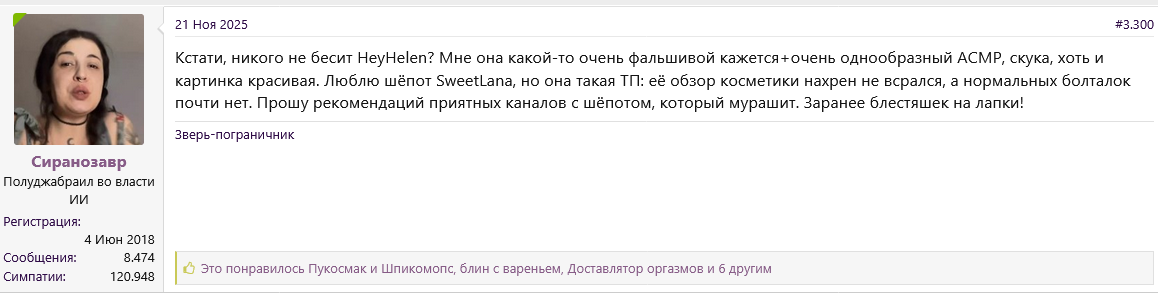 >>207822 Да. Его сюда кидали уже сто лет назад. Забыл название. Они там всех обсирают и с говном мешают. В принципе не сильно отличается от двача) лол. Хотя да, в основном там тёлки сидят обиженки. Асмрманию предали анафеме, тут её так не срали за её прошлое, как на той доске. Бабы. Хуле.