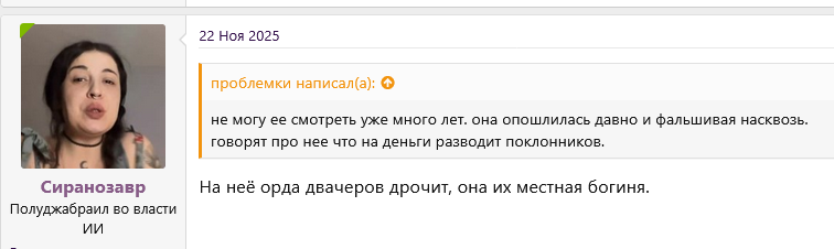 посты выше которые её засирают, делаю скорее её симпы, чтобы все считали нас хейтерами хотя лично я, просто хочу настоящих пруфов про подсолнухи, но раз всех всё устраивает и даже кто ей хамил в донатах тех, значит походу тут она сама и кто ей писал комменты на том стриме и сидят.