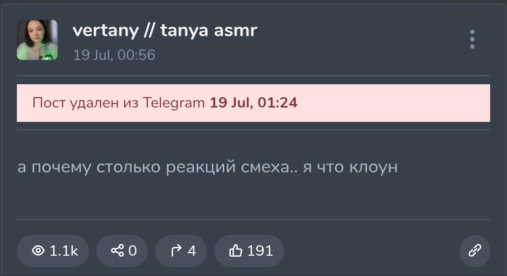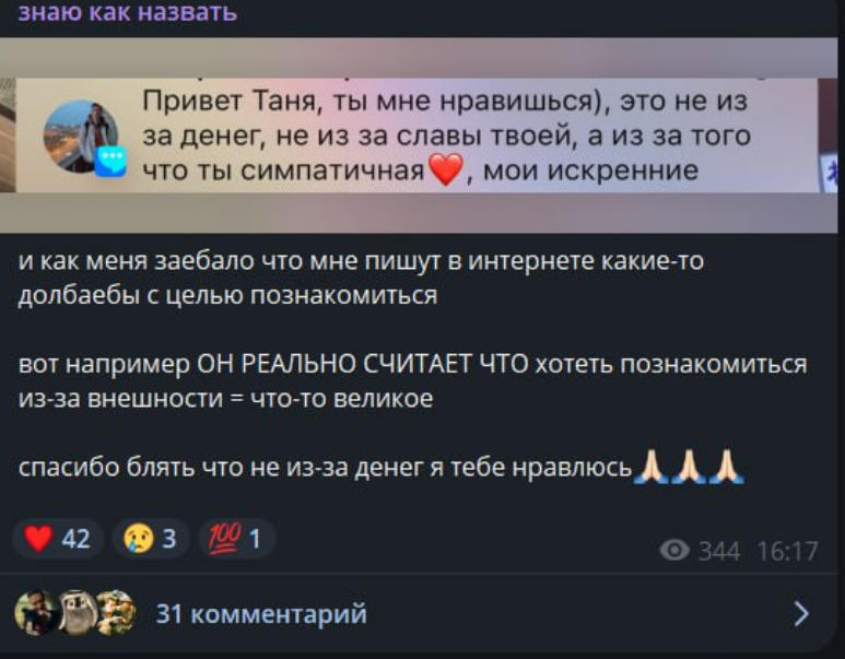>>207462 не переживай за него, у него всё хорошо,у него есть работа писать ей (деньги ему дают за это, ни в какую армию он не пошёл), и скоро не вспомните про него, она как на старых свои постах просто удалит все комментарии, а стримы снесёт, обычное для неё дело).
