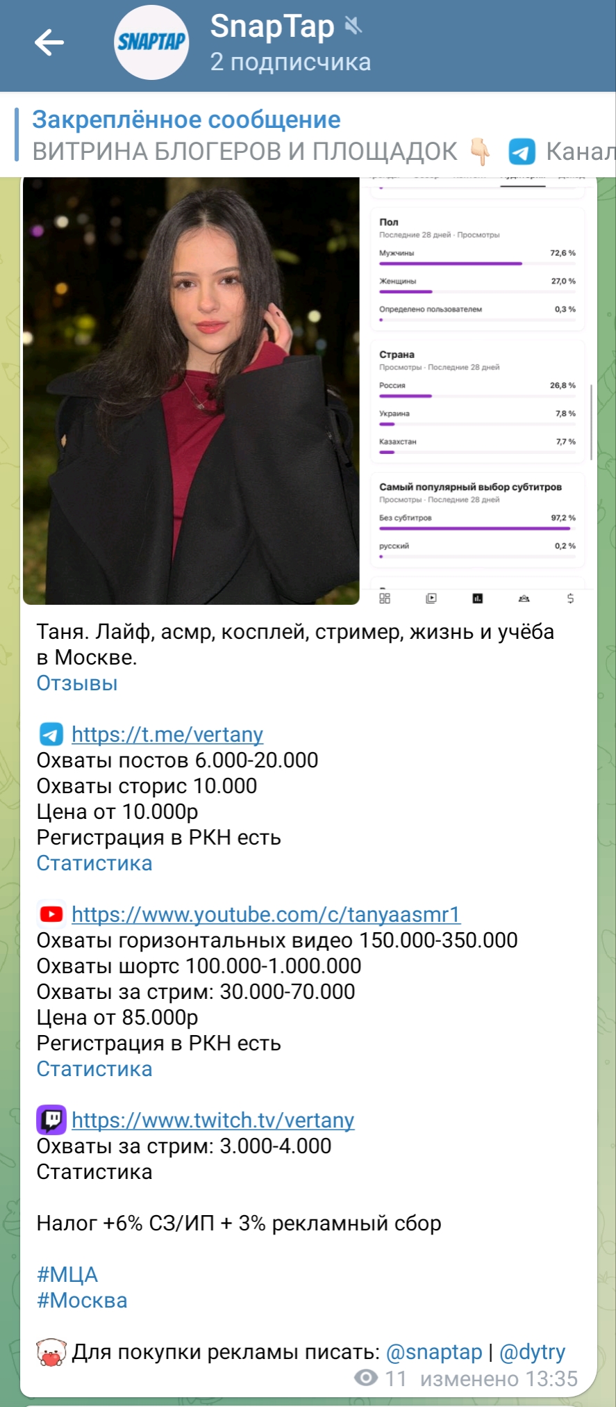 * прежде чем писать про её симпов / сколько зарабатывает, зайдите в этот тг канал допустим и увидите по статистике некоего существа, которого смотрят милфочки, и да они ему готовы и донатить и отсасывать, так что как ни крути, проблема лишь в нас самих, увы Таня реально поднимает все эти цифры сама, ещё раз убеждаюсь что я тупой шиз всего лишь, раз не зарабатываю пару соток и не сосут несколько баб в месяц, кому-то так сосут и кому-то донатят пару соток, конечно ей легче ведь она девочка, но и таких как димка надо же найти ещё, в этом и заключается часть её работы.