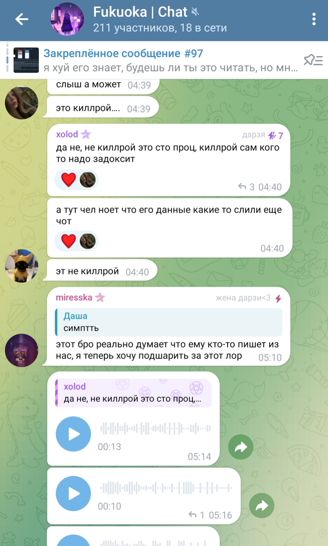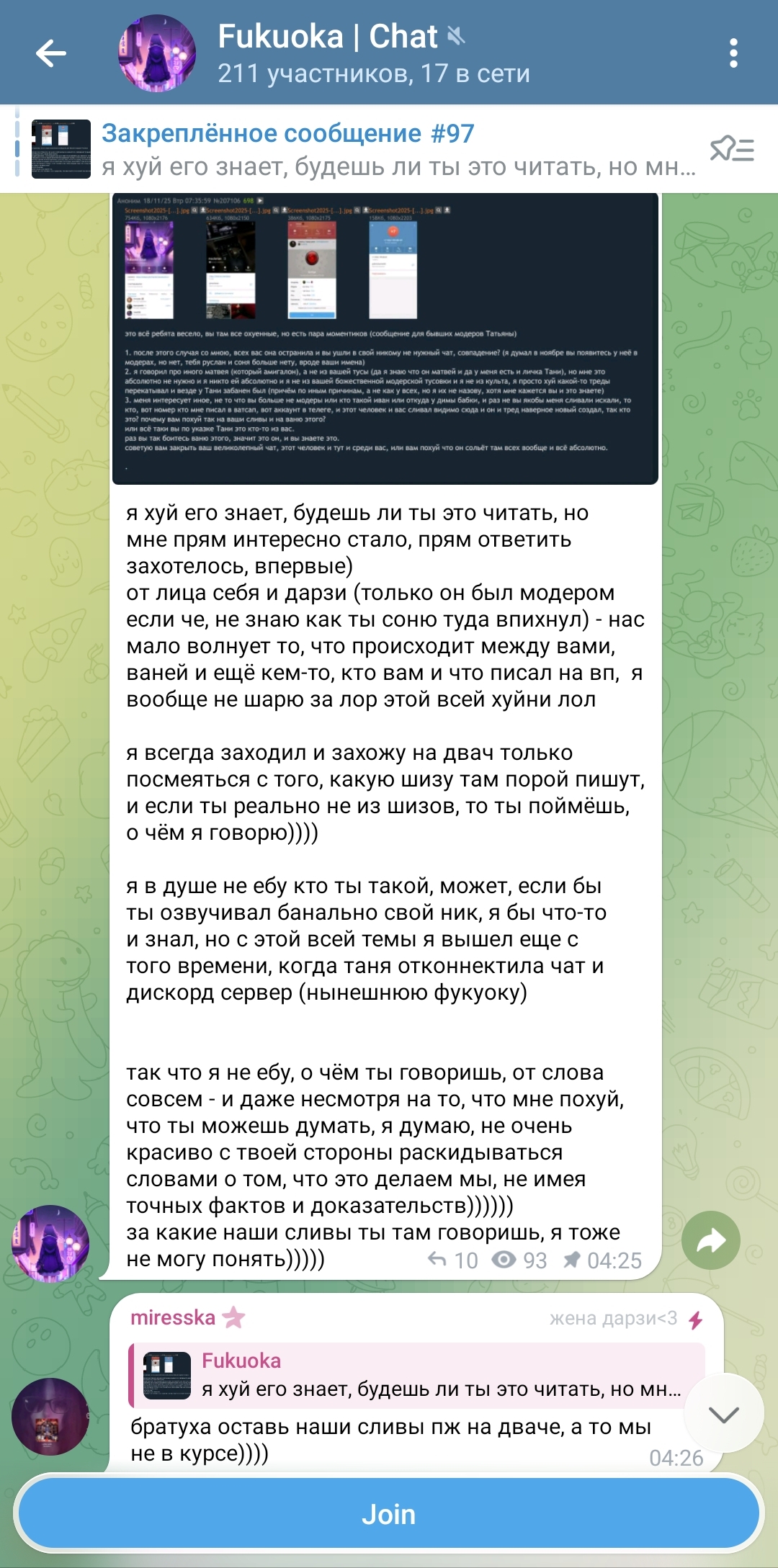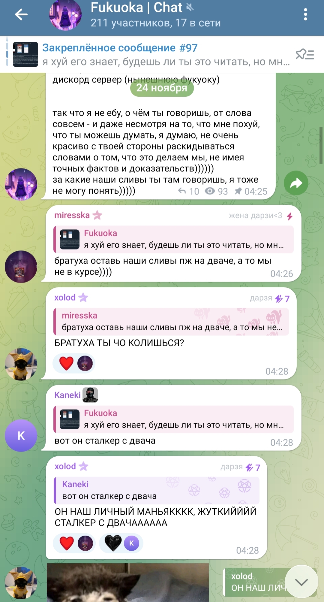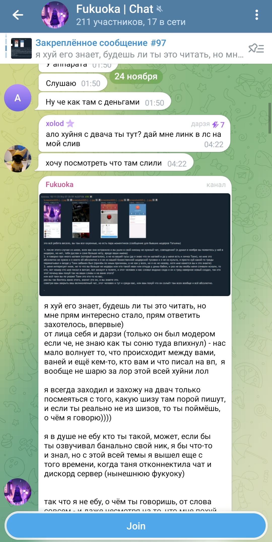 во вторых, какой-то чел, кто прям страдал по Тане и её подруге Александре от обиды на них начал сливать некие файлы из закрытой телеги, я не свидетель этого, и не застал золотое время это + также этот человек сливал таниных модераторов сюда на двач и ещё ребята, помимо того что вы меня засираете, кто вас сливал и Таню как бы и меня обсирал, если вы меж постов читали, то есть данный человек поставил в один ряд Таню вас и меня так что я не понимаю какого хуя на меня такая отрицательная реакция, я конечно не из вашего клуба элитного, ну так и похуй мне как бы, я сам по себе да и вы уже не элита, вас заменили как я понял без обид но я больше просить Таню вас вернуть не буду
