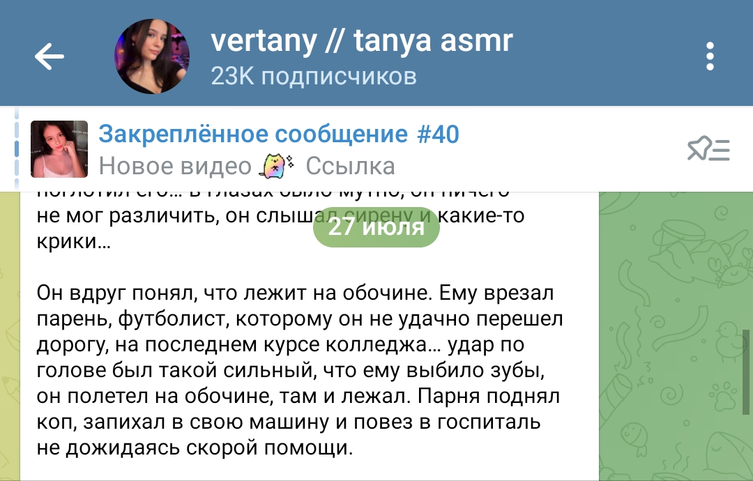 (вспоминая слова асмрне10лет с осени , её сильное желание чтобы я умер, и короче номер что я слил в конце треда, там - Лина написано было имя, ну а я знаю только одну лину, это лику, анжелику асмр10лет а также зайдя в телеграм канал Тани, у неё в конце июля огроменныы пост рассказ скопированный из реддита с некой историей, сопоставив эти 2 фактора и вспомнив что меня ненавидит их топ донатер Иван, я сделал вывод что это трио совместно хочет ко мне приехать в гости, от чего я сначала обрадовался даже, было бы прикольно, миллионер, синяя пизда и студентка мгимо едут к какому то опу треда, но радость была недолгая, ведь в тех сообщениях мне явная угроза жизни, а Таня тем постом лишь подтвердила что меня Н дваче засирают её модераторы периодически, я провёл такую логическую цепочку, такая логическая цепочка зародилась не просто так, кто не в курсе и вы модеры, я как-то написал на дваче пост :Таня если ты тут бываешь, сфоткай бутылку воды, через несколько дней, Таня сфоткала аж две бутылки воды