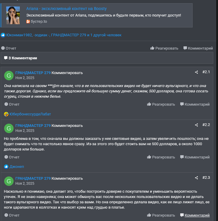 а ещёёу неё бабушка померла, но пруфов она естественно не предоставила, продолжает постить хуету во второй канал телеги свой откуда и вытащены фото выше а могла бы и подзаработать лохушка, особенно ржачно что её тискали всякие дети школьники, я бы на её месте вообще бы скрыл второй канал в телеге, но раз у неё биполярка и все мозги в сиськи ушли, это не лечится и не исправить уже, но ей повело не откиснуть месяц назад, мужик въебал ей славно, только ещё больше ебанутее даже стала вроде (кому интересно посты за ноябрь в её втором канале тг https://arianapro100asmr, это сука как же надо выбесить было мужика что он ей въебал со всей дури ахаха, разумеется она пишет что начал он первым, обычно она таким сосёт видимо, но видимо дорого назвала ценник и мужик очень обиделся, пиздец как же это угарно курица ты ебучая)