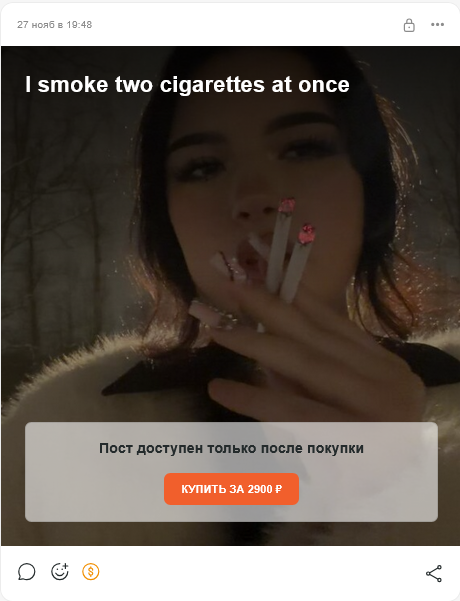 >>207898 На этот ник shketik , у нее был ТГК где она предлагала за 3к сделать видос персональный с голой грудью ,мб год назад было ,мб чуть больше, тогда она делала видосы ,щас она не отрицает что такие видосы делала ,но говорит что больше там не занимается.