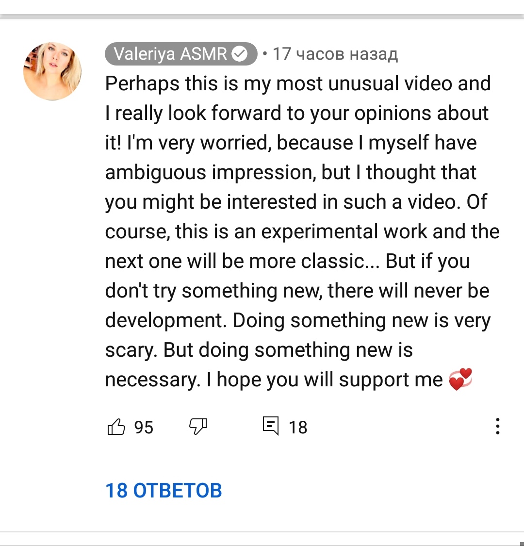 Вчера моему каналу исполнилось 5 лет. Я забыла, моя беда.. Я не знаю, как долго буду продолжать заниматься АСМР, но я благодарна всем за поддержку. Я не планировала отмечать юбилей, потому что теперь понимаю, что мой канал принес мне и много хорошего, и много плохого. Возможно, было даже ошибкой начинать его ... Я не знаю, что будет дальше, но теперь я там, где я есть. Я надеюсь, что мои видео оставили хорошие воспоминания в ваших сердцах ❤ спасибо Пидоры, доведшие её до такого, просто пидоры.