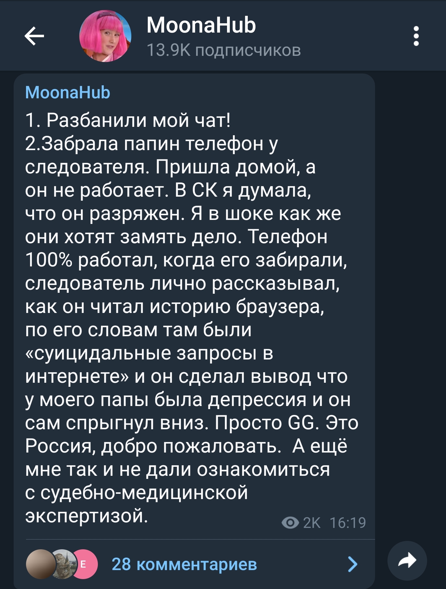 А тут размышляли о том, что муна тупо вдрызг посралась со своим отцом и придумала кулсторю как отец навсегда покинул её? Окей, допустим это бред, ну неужели никто из легиона сосача не мог найти инфу по суицидам или смертям в СПб в тот день? В нашей стране это же наверное довольно просто
