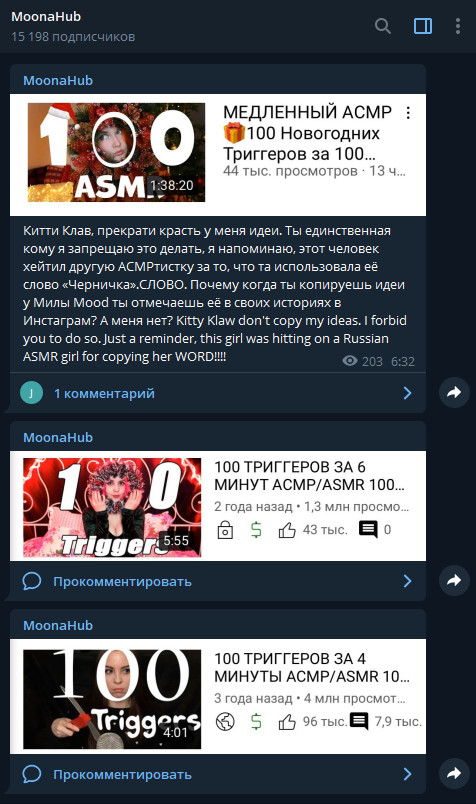 >>96183 Приколитесь, на тот момент у Танюхи 1,6к подписоты блять, и Китька приходит к ней гореть в коммах, а потом еще мутит отдельный стрим, чтобы ее потопить. Канал в 1,6к! Не смотрит она других авторов блять. Да она в каждую дырку в заборе смотрит, где асмр написано.
