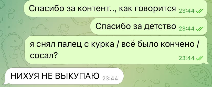 >не ел больше суток сейчас буду Слава богдану, что меня такое относительно не тревожитъ. Жрать хоть разик в день пока доступно. Ещё не время фриганствовать. Кста купил новую гориллу с гранатом\заходить к ашоту не стал\поел две сижки за проходку. Русскость - это когда есть интернет, есть пачка. А чувство голода чаем прогоняешь\чисто с одного пакета купажи варишь. > режете ему вены Там можно и порезами уровня тупых тёлок обойтись. Психуятор всё равно за скилл спросит. Мб даже плохо, что у меня билетика нема\билетик в психушку\додж санитаров длинною в жизнь. лучше тогда уж ожоги от сигарет ставить, сделав из них сердечко >сталкер два Не существует такой игры\фанфики занзакса не должны быть правдой. Даже смотреть про это убожество не хочется. Резко продолжил мучать сосалики. Щас трёху добиваю\там эмулятор бладика настроить\потом секиру пробежать. Там уже думаю точно в это играть долго опять не стану. Хотя в первый дарк 70часов подряд набегал\по шизе думал ещё пару раз пройти. >сто круток Оно ловит бонуски в жопанзе\бимба упадёт скорее с дрона тебе на башку. ПРикинь 100х чисто дада/нетнет. Покупать их тоже как будто скам. При мне 1из3 отмазывала +-обратно. Смотрим как труъ прогерс ртп всегда\один и тот же slots может иметь разные % кстати. Зависит от провайдера(пидораса). >не видел новых собак Ну видимо и в будку их. Синяя собачка тебе мопсом. >молочный коктейль Где ты такое берёшь? Из пыньтёрочки Чудо какое-то... Во всяких маках это оверпрайс параша. В калфешках если только может быть чем-то хорошим. >я мог вывести 11к но вывожу 700 рублей / короче лудомания зло Ебучее лудище\чё собакам в будку\а ленедцам в бомбу\а Зевс тебе с wilda чё. Надо всегда меру знать для вывода. Если апнул балик, то вывел бы чёто типа 5-7-10. Смело решить не останавливаться\уже та грань отчаяния, когда думаешь гори оно синем пламенем, пускай сожрёт скорее. чёт такое было однажды на шабашке с последних денег на еду+сиги\400 в 3к чуть-чуть не превратились