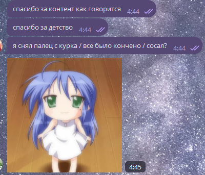Гад демн мэн, вот это ты вовремя. Спину чёто крючит\лежу авторитетно на шконке. Надо сходить следовательно за пичей от бишмиляйтеров/там табачка рядом, считаю это плюсом для меня, мб поэтому хожу в конкретную шавурмовную. Музыку послушать да энергосом домазать приятность уровня б этого дня. По сути ток отмашка нужна была\хоршо, что не завтра мне реплаинул. Завтра уже надо в лесу вишней сладкой тянуться будет под утро да лисы с черникой собирать. > некроприём тушки моей в морг Найс ты конечно попыткер. Чисто агент 007: ноль дней работал\ноль друзей\семь попыток сруицида. го лезвием по вене 50на50 друг друга ебанём