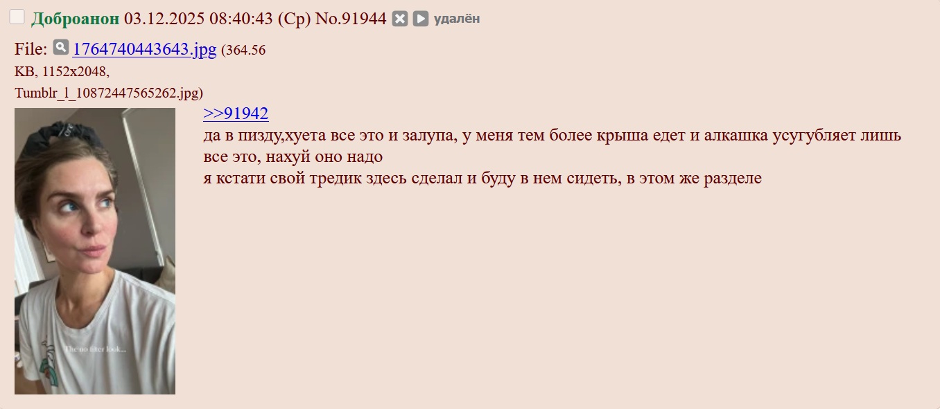 >Что... А какова причина бана? И почему тогда я не забанен? Если это "обсуждение модерации", то тогда мы оба в ней повинны. Бан за обход бана. >Вот, кстати, очередной пример странного управленческого решения. Если мод знает нас и давно присматривает за нашим тредом, он не может не понимать, что своими действиями делает только хуже переживающему не самые лучшие дни комьюнити. >Что это - равнодушие? Облаченное в рамки закона вредительство, вроде "вы только дайте мне повод, а уж я вам покажу"? 3ачем он устраивал гонения на вирты два года назад, когда треды переживали новый расцвет после глухого 22-го? Почему мы не можем кумить в фаге, если буквально половина соседних тредов занимается этим, а в некоторых и вовсе постят откровенную порнуху, как в треде с Бонби, например? Вопросы, вопросы... Все мотивы в его голове, и мы о них доподлинно узнать никак не можем. Только строить предположения, опираясь на свои собственные представления о хорошем и плохом и на свое понимание целесообразности. А у него, может быть, есть свои желания, цели и собственная картина мира. >А на тебе было короткое платьице горничной с фартуком и белыми носочками? В чепчике и с большим мохнатым пипидастром… >А как тогда он, сидя в фаге, банил ребят в бэ, да еще и предупреждал (прямо там, в треде) Харли с Оливией, что если поймает их еще раз - отправит в бан на неделю? Честно, я не знаю, тут слишком много вариантов, насчет каждого которых нельзя точно сказать, так это или не так. >По-моему только о том, что в фаг просто больше правил, чем в бэ, и кое-кто относится к их исполнению весьма щепетильно. Иногда кажется, что это именно в треде знаменитостей больше правил. В других же более-менее вольница: народ общается, самовыражается и постит такое, от чего у нас остается только "спасибо, мод"... >Ну хорошо. А какие-то интересные факты у тебя есть? Личные наблюдения? Кто-то намекал на то, что перебанит всех сидящих тут. Это я очень хорошо помню. >Мне, например, говорили в конфе, что один модератор "залипает" в нашем треде в /b/ и у него даже имеется аватарка. Это странное мнение. Кто-то из наших вряд ли стал бы устраивать на наш тред гонения и удалять сразу после создания. Пару месяцев назад такое было! >А эра, если я правильно помню, как минимум единожды удаляли или даже банили. Разумеется, ты можешь теперь заявить, что это могло быть сделано для отвода глаз, но то же говорят и про меня, поэтому я считаю подобные подозрения слишком уж притянутыми. Это чистый зог! Но это же не отменяет ни бахвальства, ни угроз банами, ни того факта, что именно ЭР ставил Боксеру условия нахождения в fag. А то, о чем говоришь ты, оно только добавляет странности во всю эту историю, и пока не откроются все события, которые происходили за кулисами, у нас паззл не будет складываться, потому что каких-то важных кусочков нам не хватит. >Ну тогда он довольно много вещей делает специально - от прогнозирования грядущих событий до характера комментариев, которыми сопровождает происходящее в треде. Просто когда у человека есть вилка, это в чем-то, да проявляется. А ЭР ведет себя как совершенно обыкновенный анон с собственным непробиваемым манямирком. Ну, он вроде сам как минимум намекает на свою необычность и исключительность, да и про его раздел кто-то не так давно говорил, что там можно токсить на всех, кроме ЭРа. >Все. Больше я за тебя не боюсь. Ты определ