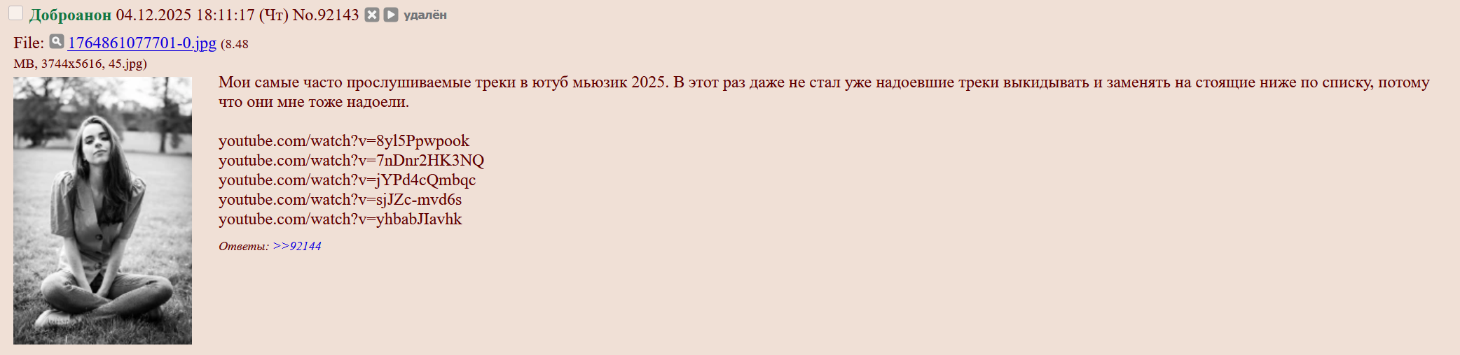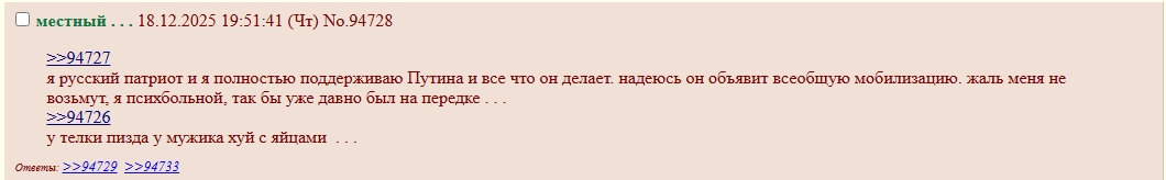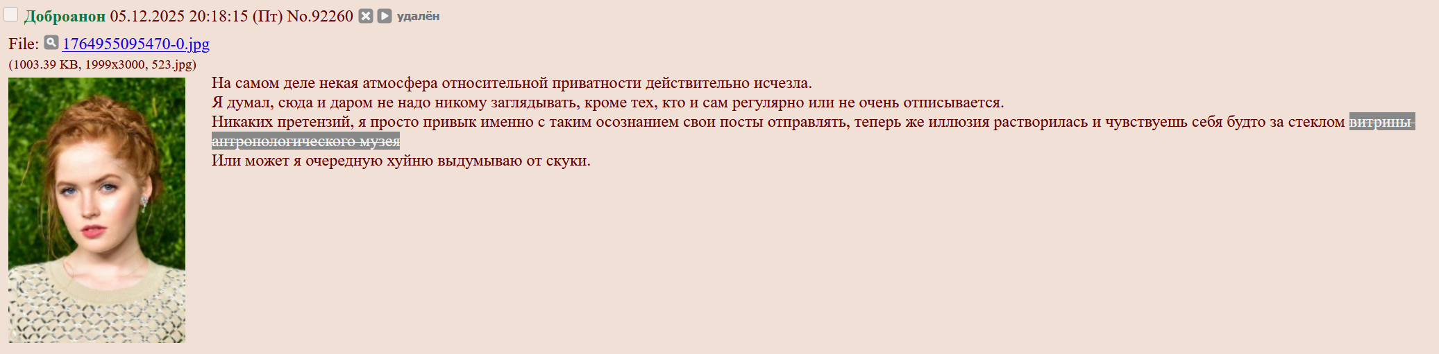 >>3992549 >Просто я выделяю несколько наиболее ярких конфликтов в истории треда: первый - вокруг перекатов в ковидные времена (20), второй - это война с Ваней (23) и третий - затяжной срач между Эром и Боксером, который вытек из предыдущего конфликта (24-25). Первое я, кстати, не особенно считаю за часть плохих времен: как-то сравнительно гуманно все было, что ли, со вкусом и изюминкой... А потом - да, сплошняком поперло то самое, плохо пахнущее и не нужное никому, кроме пары не желающих отступать постеров и нескольких безаватарочных хулиганов-провокаторов но мне их тоже жалко, потому что эти интересующиеся нами могли присоединиться к постингу знаменитостей, если бы нездоровая ситуация не открыла им деструктивный путь для развлечения и самовыражения. >Ты, вероятно, говоришь об одном из последних двух... Или же вообще их не разделяешь. Для меня это то затухающий, то вспыхивающий, но все же единый и непрерывный процесс движения в самую толщу помойки. >Ну ты же не из тех, кто так легко прогоняется? Да и бан в фаге наверняка истечет через пару дней. А чтобы не скучал, буду периодически подкармливать тебя чем-нибудь сладеньким и питательным! Мой срок должен был уже давно закончиться. Наверное, стоит попытаться вернуться и посмотреть, прогонят ли меня снова. Попробую когда-нибудь, когда будет время и повод встрять в чью-нибудь болтовню. >Я вот например совсем не понимаю Боксера, который свои обидки возвел в принцип и демонстративно не заходит туда, будто легитимизируя идею, что фаг - это эр, а эр - это фаг. Хотя может он тоже думает, что тот модератор. Его можно понять, если вспомнить, что в свое время ЭР прямо и безапелляционно запрещал ему туда приходить. >Я там вообще не появляюсь. Прилично фажику в таком признаваться? Ну... Там обсуждают знаменитостей. Наверное, именно поэтому я туда заглядываю примерно раз в год. Но разве это плохое место? >Побочные? Я сразу представляю себе треды аналогичной направленности - оцени тян, лучшая фигура для девушки... Но я вообще-то говорю о самых разных тредах вообще, где зачастую можно встретить всяких интересных людей. И не обязательно ассоциированных со мной лично, кстати. Нет-нет, я про наших, разбредающихся по всему b и пасущихся, например, в треде у Ани или в совсем случайных тредах, где они начинают постить аватарки, чатиться и устраивать балаганчик. А еще про самопроизвольные вытекания из загонов посреди недели. >Он над этим долго и старательно работал, уважь человека! Рад за него, не рад за всех остальных... >Просто Джокер пока что еще не настолько съехал с катушек, но, кажется, движется в том же направлении. Он явно не в себе, если он не притворяется или отыгрывает намеченную роль. >И лично в моем рейтинге самых отвратных типов он оставляет всех шизиков асулима далеко позади - тут и его повадки, и вкусы, и характер, и даже стиль письма, и полнейшее неуважение к окружающим (хоть и продиктованное, вероятно, отчасти болезнью). Он просто похож на буйного маргинала, только и всего. Меня это совсем не трогает, если не считать его попыток постить селфи. >А может он просто выгорел и совсем потерял ко всему интерес. Ну нееет! Он по-прежнему способен отпускать колкости, значит тот самый и все еще ого-го! >К сожалению, в лисах не разбираюсь. А вот тут >>3992575 написано, что это... ты! Я, конечно, не очень доверяю голосам без аватарок, но мнение такое существу