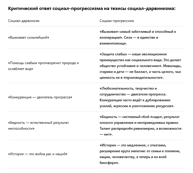 ### 11. Ошибка уровня анализа: индивидуум vs. система Социал-дарвинист часто совершает фундаментальную ошибку, перенося законы биологической эволюции (где единицей отбора может быть ген или вид) напрямую на социальные отношения между людьми. * В сложном обществе «сила» — системное свойство. Успех зависит не только от личной доблести, но и от инфраструктуры, права, доверия, кооперации тысяч незнакомцев. Тунеядец, пользующийся благами цивилизации (от электричества до социальных лифтов), но отрицающий необходимость вклада в её поддержание, — системный паразит. Он пользуется плодами кооперации, которую его же философия стремится уничтожить. Он — вирус, который хвалит конкуренцию, но живет только внутри сложного, кооперативного организма-хозяина (общества).