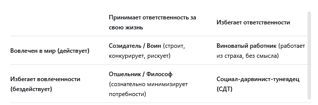 **Он — не отшельник,** потому что тот сознательно отказывается от благ общества, принимая на себя ответственность за свою аскезу. **СДТ же хочет все блага, но без ответственности и действий.**
