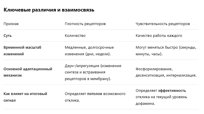 **Вывод:** Плотность рецепторов — это **структурный** параметр ("сколько детекторов"), а чувствительность — **функциональный** ("насколько хорошо каждый детектор работает"). Мозг использует оба этих инструмента для тонкой настройки дофаминовой передачи, и дисбаланс в любом из них может лежать в основе неврологических и психических расстройств.