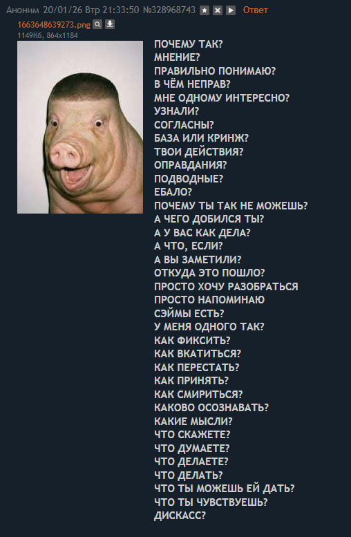 >Ебало? Ебало - это не аргумент, а крик инцела без контента. Покажи сначала свой профиль с 10к фолловеров и тянками в сторис, а не спамь "ебало" как школьник-пердик. Сажа за отсутствие креатива, иди учись диалогу в /soc/, а не бугуртись.
