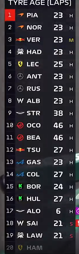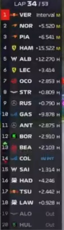 >>6653390 Ну едут, первые пару кругов была борьба там чет побадались поменялись позициями. Но все, 25 кругов едут по кругу в 6 секундах друг от друга. Обгон за 17 место не интересно, уж извините