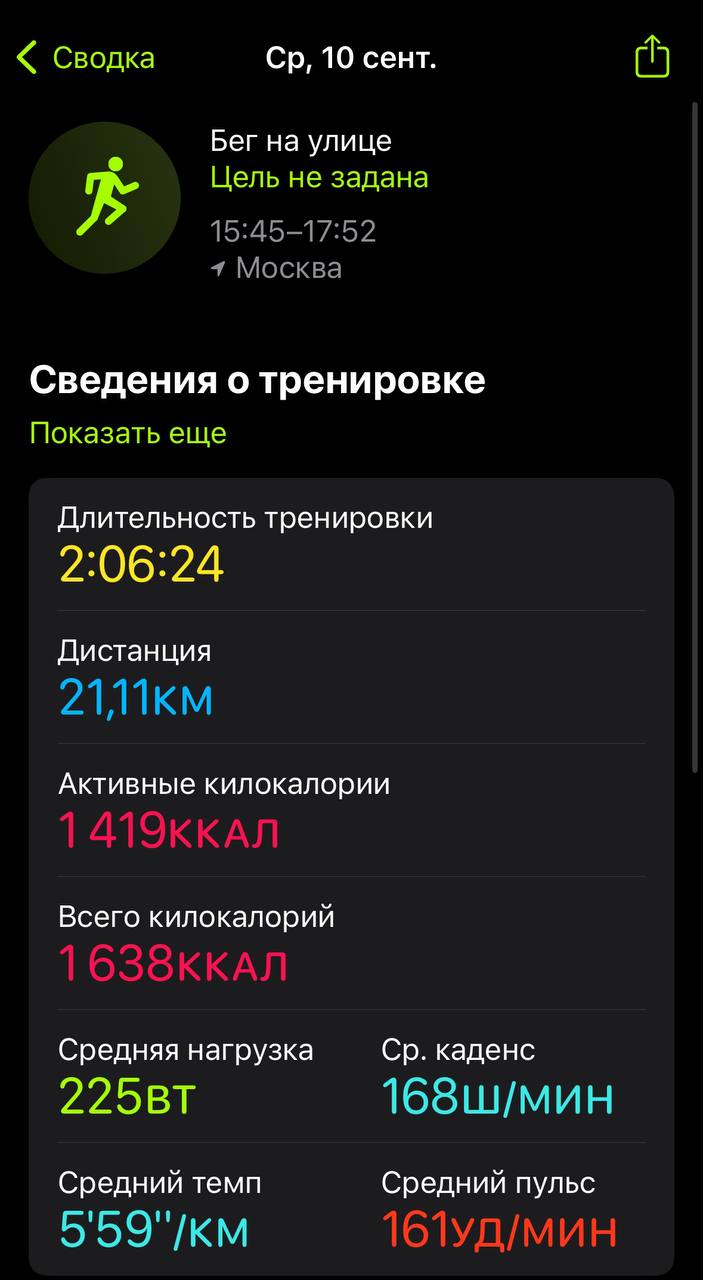 Единственный раз в жизни я бежал полумарафон 17 мая 2019 года. И пробежал тогда 21 км за 2 часа и 25 секунд (5’43 мин/км). А сейчас - 21.1 км за 2 часа 6 минут и 24 секунды (5’59 мин/км).