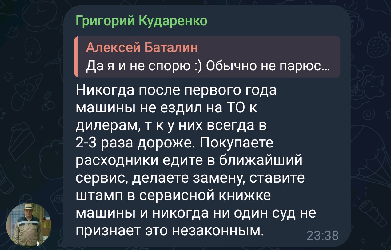 >первые 5 лет обслуживаются у ОД 1. Помимо ТО есть куча других работ, включая межсервисное обслуживание, ремонты не попадающие под гарантию, кузовной ремонт и так далее. 2. Ты будешь ржать, но далеко не все люди с новой тачкой обслуживаются у ОД. Замена маспа дороже на 3 тысячи чем в гараже у Петровича, может повергнуть многих в шок.