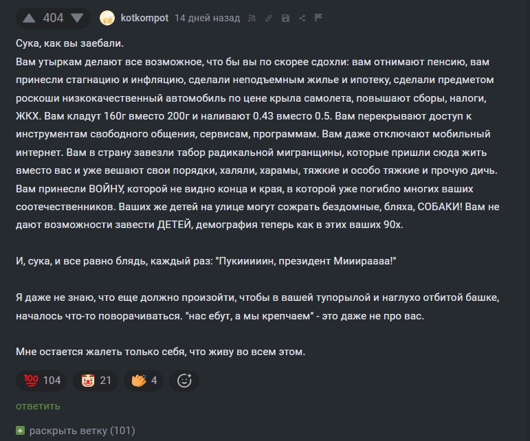 >>6684239 >это барен не заглотил, а только кончик защеку принял Понял тебя, швынтус. Я даже не против. Придет барен к китайскому хозяину, оближет его китайские яица и дальше станет свои газенвагены клепать. Вот только нахуя это на других проецировать, свынь? >Как там лада искра в максималке на мешалке Все еще лучше гнилой таврии или бесплатного бусика в пидарешт. >норм сосётся? Вам? Видимо, норм. Нового майдана нет, народу швыну все устраивает. И нищета и 1.7кк дохлых тарабсов и закрытые границы. Главное, что у москаляки ИСКРА НА МЕХАНИКЕ! Только уиграли, как всегда.
