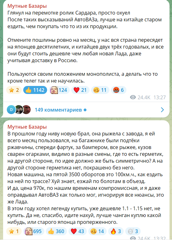 >>6707225 А теперь посмотри сколько новых машин продается даже со всеми ебейшими поборами и накрутками, даже при том что китайским партнерам уже активно вставляют палки в колеса с локализацей. Люди покупают буквально всякий мусор в который сам китаец срать не сядет, всякий JAC, SWM, омоду, джетту ваз, beijing и т.п. Самая популярная машина в москве это хавал джолион. Какая из этих машин продается на механике, м? В то время как у автоваза забиты все площадки и максим соколов там репу чешет почему так. Я уже не говорю про приморье там.