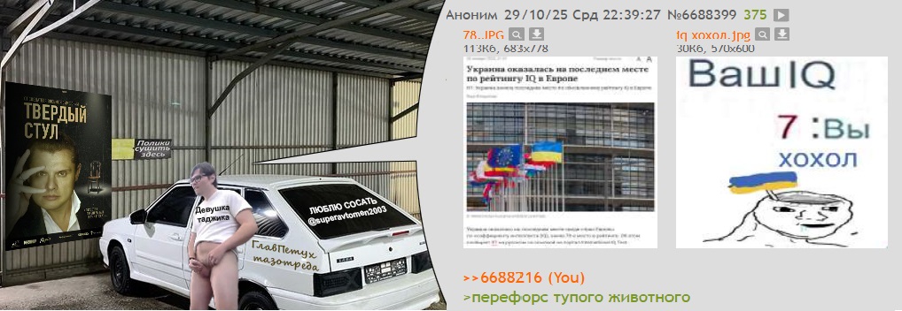 >>6688996 >не хочется повторять за хохлами Так ты и есть хахлуха. Хабалка из ципсо, скорей всего. И прав и машину утебя нет, так что пошла нахуй, дура уродливая.