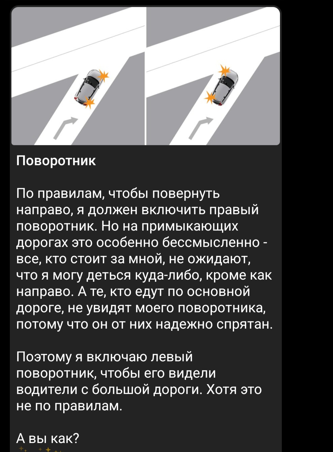 >>6696044 (OP) Здравствуйте. Сегодня проходил 2 раза один поворот направо, в частных домах. Дорога, в этом месте, достаточно скользкая, резина у меня шиповка зимняя, в нормальном состоянии, протектор целый, шипы на месте. И в первый раз все было хорошо, спокойно прошел. А вот во второй раз когда начал проходить в момент, когда я уже повернул, машина тупо стала неуправляемая. Я сейчас уже и непомню, что точно было, то ли снос, то ли занос, я если честно по неопытности пока не могу отличить, но ее просто водило. И повело ее в сторону дома, где стоял мужик и чистил машину, прям вот в него. Я резко нажал на тормоз и это, на удивление, спасло ситуацию, машина пусть и тяжело, но остановилась. Мужик стоял в шоке, но все целы, в том числе и его машина, я же просто уехал от сюда куда подальше. И вот вопрос, на ютубе часто говорят, что при заносе или сносе нельзя ни в коем случае жать на тормоз. При это сегодня я именно так и сделал и машина сумела таки остановиться. Так почему так? И вообще, как так вышло, что мою машину понесло? Вроде резина зимняя, но правда поворот был весьма крутой, может из за этого? Где то руль резко крутанул и все... Если честно, после такой ситуации немного очково теперь повторно садиться за руль, при это в моменте я еще не мало проехал и по началу было даже не так страшно, но вот придя домой и осознав произошедшее стало уже более очково.