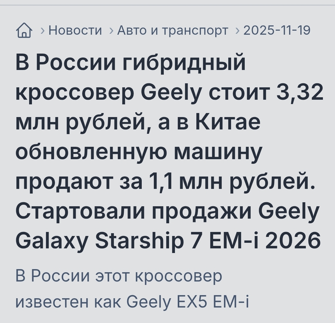 Geely объявила об официальном выводе на рынок РФ кроссовера EX5 EM-i Pro версия — 3 569 990 рублей Max - 3 869 990 рублей Оригинальное название модели на китайском рынке — Geely Galaxy Starship 7